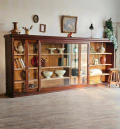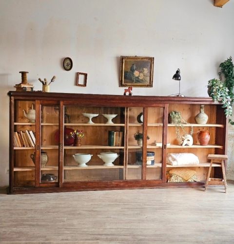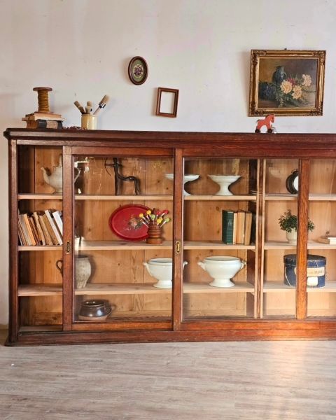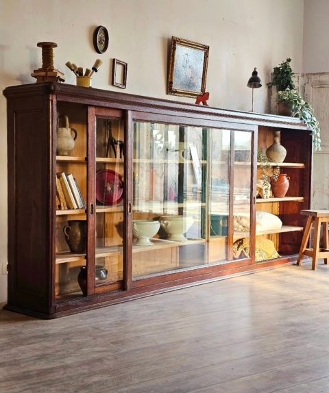 Ancienne grande vitrine de métier des années 30 en chêne massif dans sa patine d'origine.