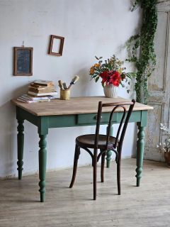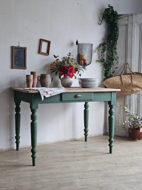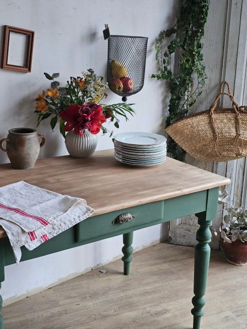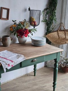 Ancienne table de ferme avec tiroir central et jolis pieds tournés.