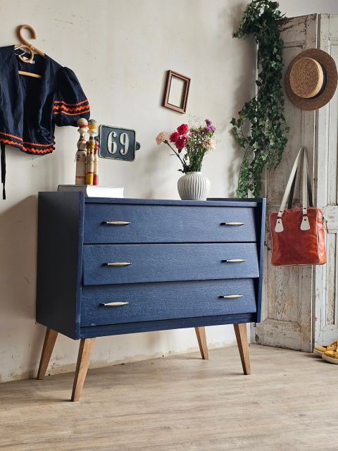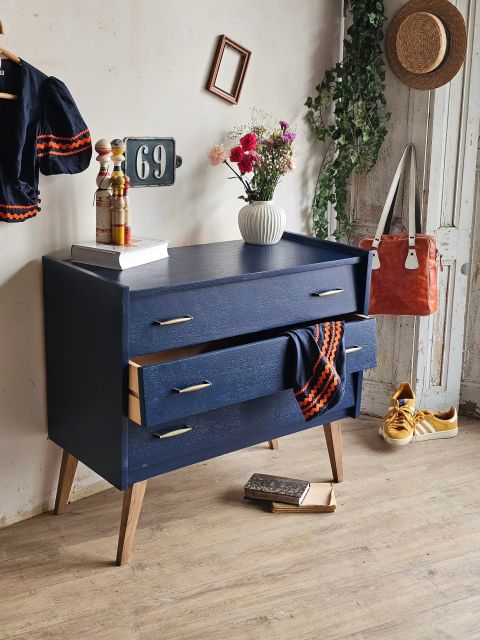 Joli bleu soutenu qui contraste avec les pieds bois.